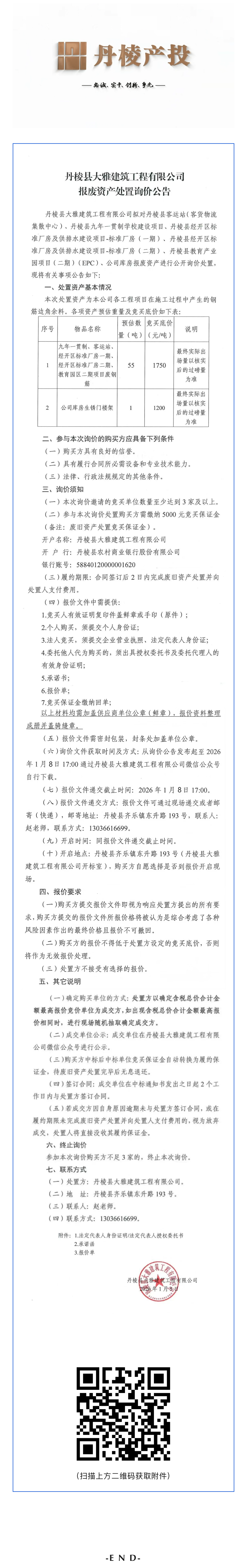 丹棱縣大雅建筑工程有限公司報廢資產(chǎn)處置詢(xún)價(jià)公告